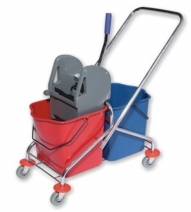 Двойная уборочная тележка с металической основой, 46л (2*23л). Габариты: 860×410×900 мм. Металлический хромированный каркас, два пластиковых ведра, универсальный отжим, перекидная ручка для удобства перевозки, противоударные бамперы, предохраняющие поверхности от царапин.
